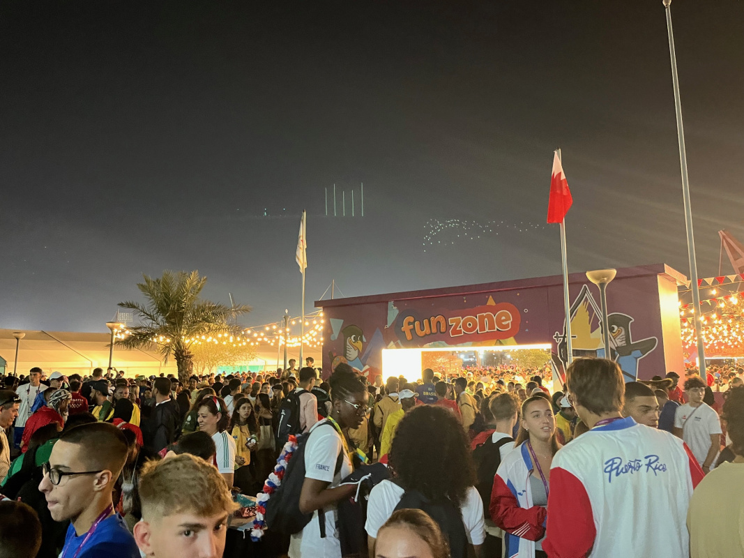 Tako so neučakani košarkarice, košarkarji in odbojkarji dopoldne preživeli v hotelskem fitnesu in bazenu, da so nadomestili odpadli trening. Po tem smo se vsi skupaj odpravili na kosilo (mimogrede: hrana v hotelu je odliiiiična ;)), nato pa z odpravo s Tretje gimnazije Maribor do prizorišča otvoritvene slovesnosti. Tam je trajalo kar dolgo, da so na nacionalni bahrajnski stadion »zložili« tekmovalce in ostale iz 71 držav. Med tem časom so se naši dijakinje in dijaki spoprijateljili z vrstniki iz Maribora, nekateri tudi z gimnazijci iz drugih držav, ogledali smo si tudi tekmovanje v katah v karateju. Kot ste lahko videli na instagramu, smo tudi pokazali, kaj zmoremo. Ampak čakanje se je izplačalo: gostitelji so uprizorili pravi spektakel. Na dogodku ni manjkalo petja, plesa in lutk, na koncu pa smo si lahko ogledali kar nekajminutni ognjemet. Za kanček vzdušja pa si oglejte našo galerijo …