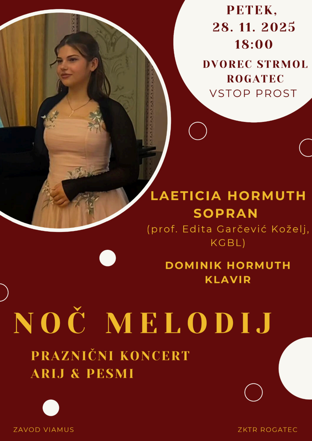 V imenu zavoda VIAMUS in ZKTR Rogatec ste lepo vabljeni na njen prvi samostojni koncert NOČ MELODIJ – praznični koncert arij in pesmi, ki bo v petek, 28. novembra 2025, ob 18. uri na dvorcu Strmol v Rogatcu.